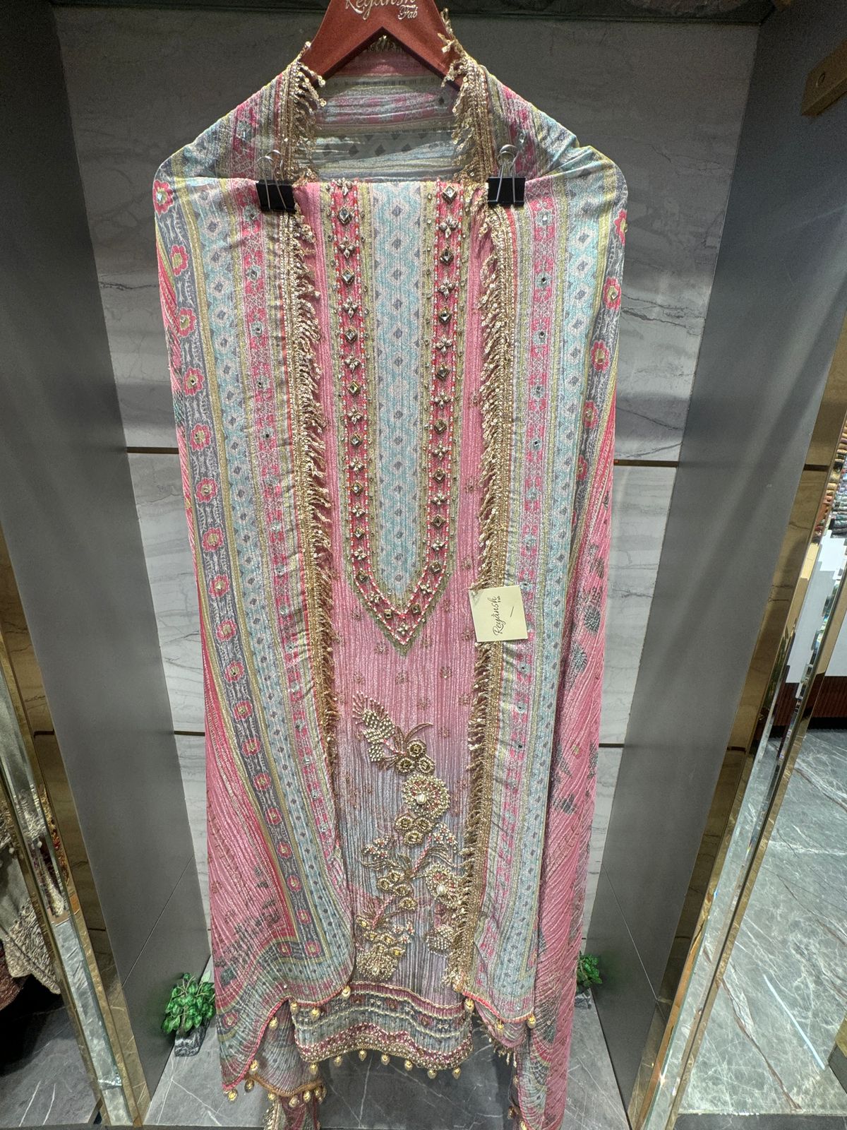 Crush Tissue Bandhani Print Unstitched Suit, adorned with delicate handwork, mirror detailing, and cutdana embroidery, making it perfect for festive and special occasions.
