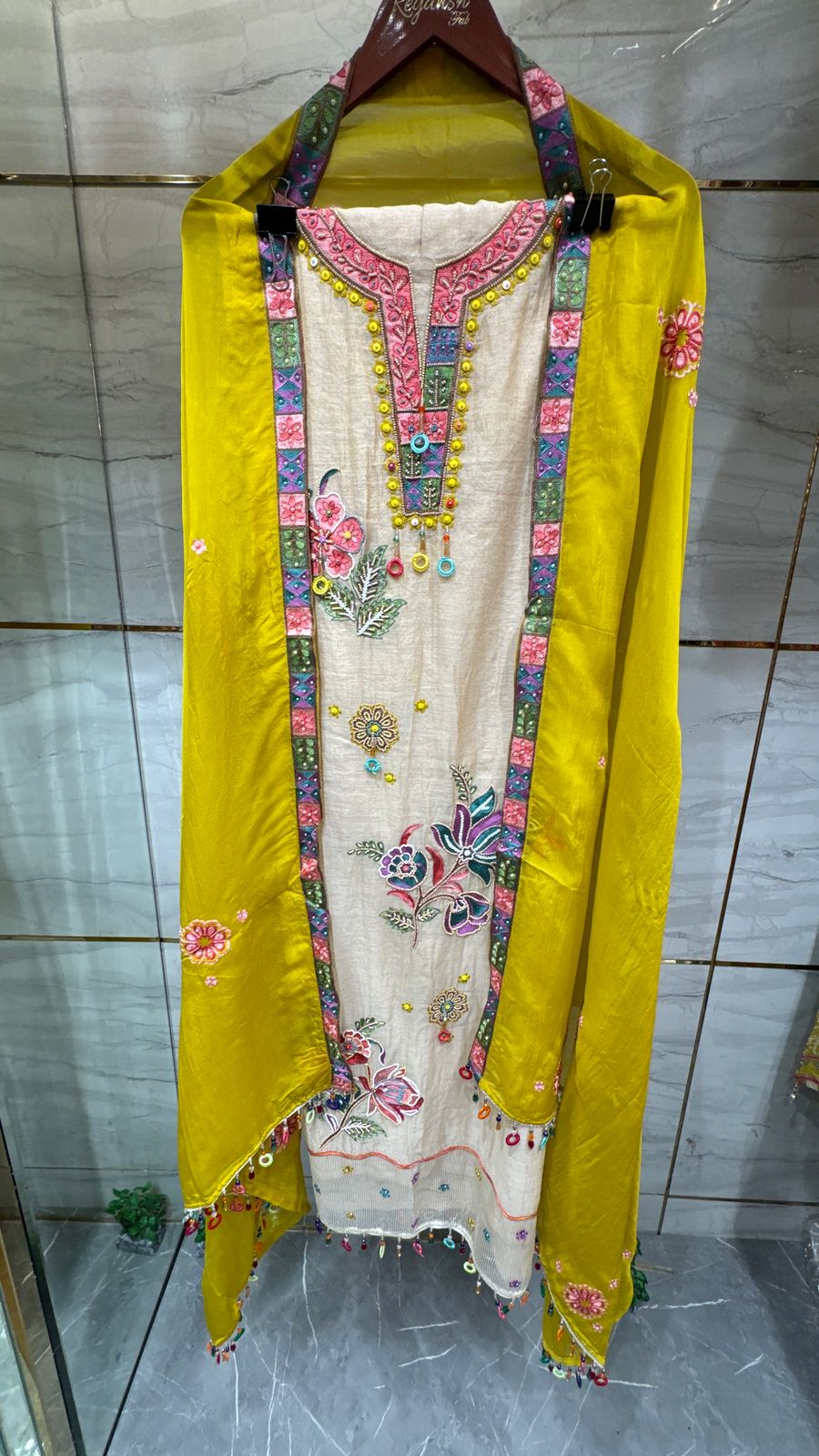 Pure Mal Chanderi Cotton Kurta Set with Multi Hand Embroidery & Contrast Dupatta