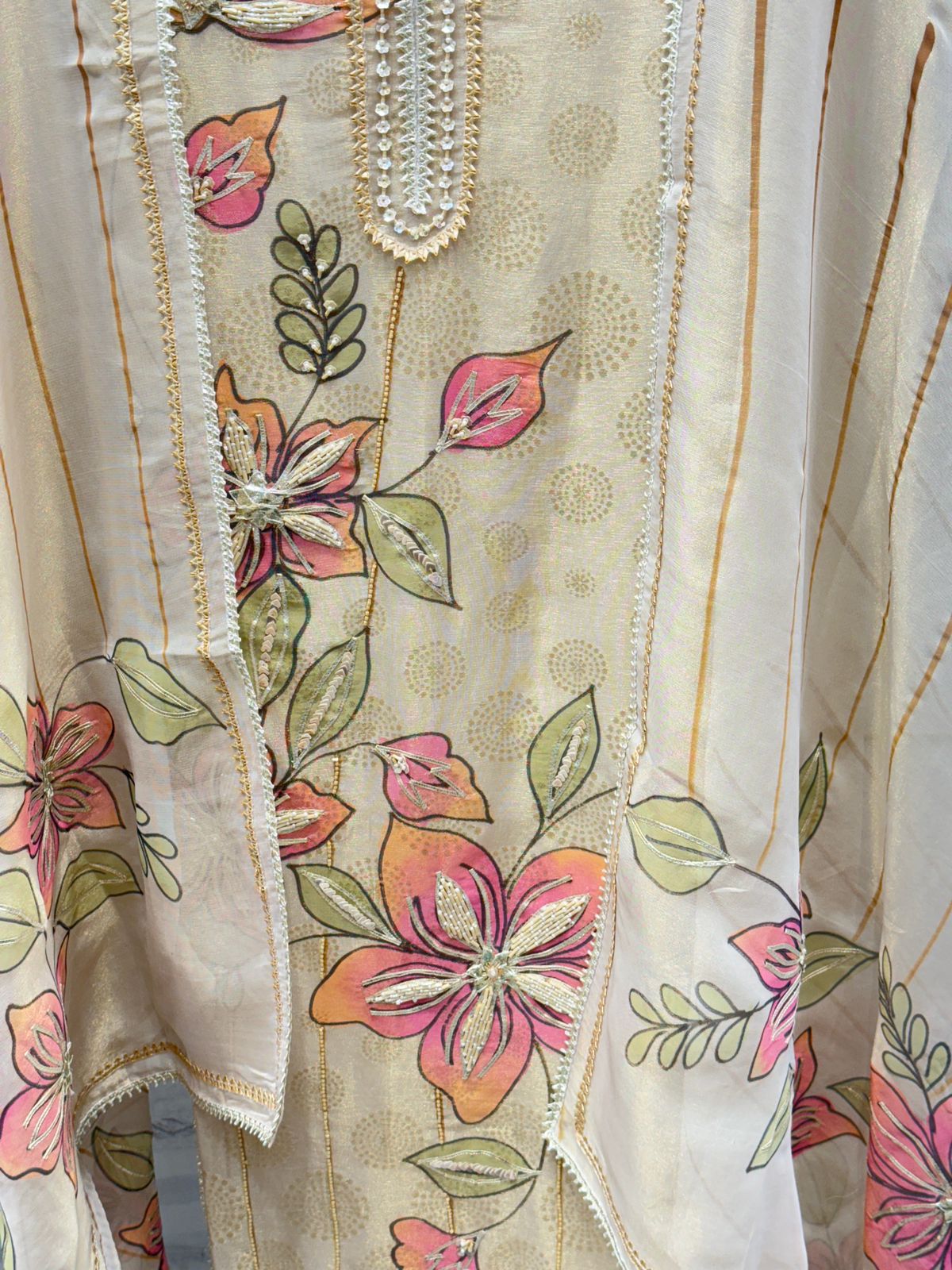 Embroidery: Intricate floral embroidery spread gracefully across the fabric, adding a touch of timeless elegance.